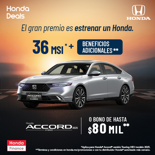 Honda® ACCORD® 2025 ACCORD® FINANCE 36 MSI Vigencia del 01 al 31 de octubre de 2025 o hasta agotar existencias lo que suceda primero. 36 meses sin intereses en la compra de una Honda® Accord® en versión TOURING HEV modelo 2025, con 50% de enganche y plazo de 36 meses, con un CAT del 29.2% sin IVA promedio informativo. No considera el costo del seguro de daños ni de vida, mismo que deberá ser cubierto financiado en la mensualidad. Crédito exclusivo con Honda Finance®. Aplican restricciones y está sujeto a aprobación de crédito. No incluye accesorios del vehículo. No aplica con otras promociones. Para más información acerca de requisitos y opciones de financiamiento visite su Distribuidor autorizado Honda® más cercano.