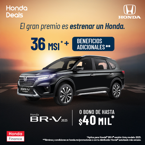 Honda® BR-V® 2025 BR-V® FINANCE 36 MSI Vigencia del 01 al 31 de octubre de 2025 o hasta agotar existencias lo que suceda primero. 36 meses sin intereses en la compra de una Honda® BR-V® versión UNIQ modelo 2025, con 50% de enganche y plazo de 36 meses, con un CAT de 30.0% sin IVA promedio informativo. No considera el costo del seguro de daños ni de vida, mismo que deberá ser cubierto financiado en la mensualidad. Crédito exclusivo con Honda Finance®. Aplican restricciones y está sujeto a aprobación de crédito. No incluye accesorios del vehículo. No aplica con otras promociones. Para más información acerca de requisitos y opciones de financiamiento visite su Distribuidor autorizado Honda® más cercano.