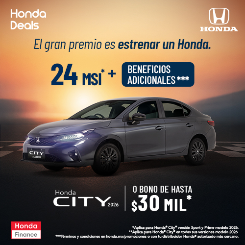 Honda CITY® 2026 Honda CITY® FINANCE 24 MSI Vigencia del 01 al 31 de octubre de 2025 o hasta agotar existencia lo que suceda primero. 24 meses sin intereses en la compra de un Honda® City® versión SPORT y PRIME modelo 2026, con 50% de enganche y plazo de 24 meses, con un CAT de 32.3% sin IVA promedio informativo. No considera el costo del seguro de daños ni de vida, mismo que deberá ser cubierto financiado en la mensualidad. Crédito exclusivo con Honda Finance®. Aplican restricciones y está sujeto a aprobación de crédito. No incluye accesorios del vehículo. No aplica con otras promociones. Para más información acerca de requisitos y opciones de financiamiento visite su Distribuidor autorizado Honda® más cercano.