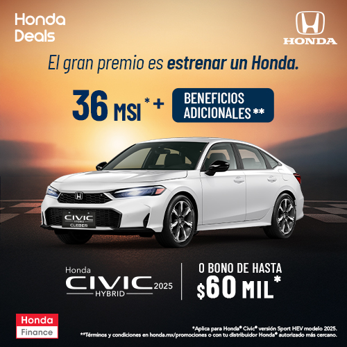 Honda® CIVIC® 2025 CIVIC® FINANCE 36 MSI Vigencia del 01 al 31 de octubre de 2025 o hasta agotar existencia lo que suceda primero. 36 meses sin intereses en la compra de una Honda® Civic® en versión SPORT HEV modelo 2025, con 50% de enganche y plazo de 36 meses, con CAT del 31.9% sin IVA promedio informativo. No considera el costo del seguro de daños ni de vida, mismo que deberá ser cubierto financiado en la mensualidad. Crédito exclusivo con Honda Finance®. Aplican restricciones y está sujeto a aprobación de crédito. No incluye accesorios del vehículo. No aplica con otras promociones. Para más información acerca de requisitos y opciones de financiamiento visite su Distribuidor autorizado Honda® más cercano.