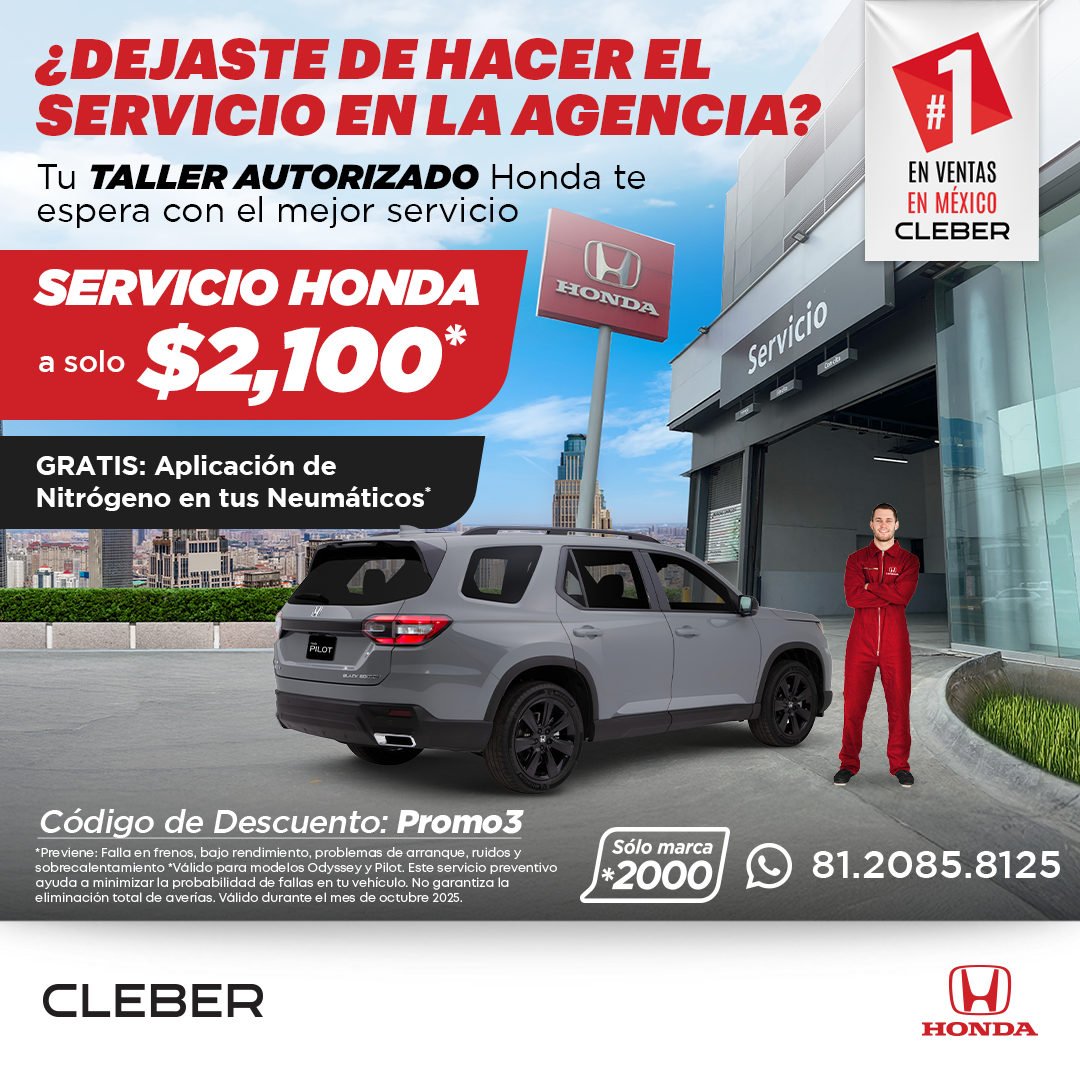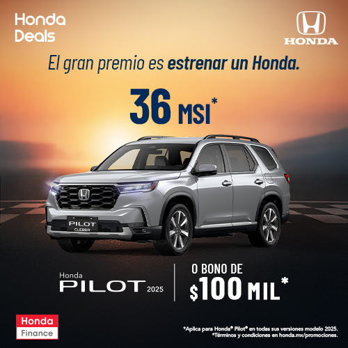 Honda Pilot® FINANCE 36 MSI Vigencia del 01 al 31 de octubre de 2025 o hasta agotar existencias lo que suceda primero. 36 meses sin intereses en la compra de una Honda Pilot® versión TOURING y BLACK EDITION modelo 2025, con 50% de enganche y plazo de 36 meses, con un CAT de 26.80% sin IVA promedio informativo. No considera el costo del seguro de daños ni de vida, mismo que deberá ser cubierto financiado en la mensualidad. Crédito exclusivo con Honda Finance®. Aplican restricciones y está sujeto a aprobación de crédito. No incluye accesorios del vehículo. No aplica con otras promociones. Para más información acerca de requisitos y opciones de financiamiento visite su Distribuidor autorizado Honda® más cercano.