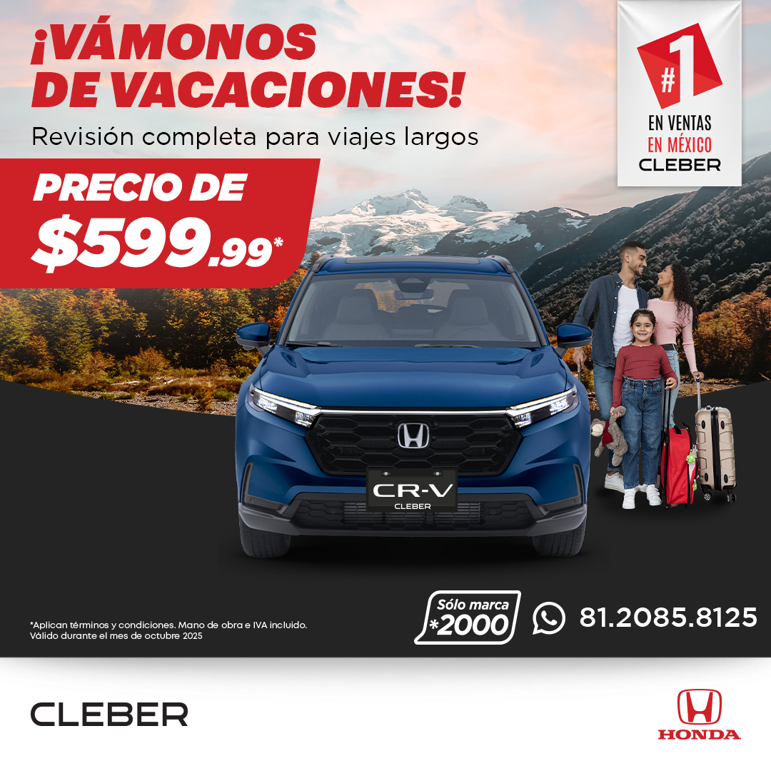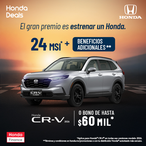 Honda® CR-V® 2026 CR-V® FINANCE 24 MSI Vigencia del 01 al 31 de octubre de 2025 o hasta agotar existencias lo que suceda primero. 24 meses sin intereses en la compra de una Honda® CR-V® en versión TOURING, TOURING HEV y SPORT TOURING HEV modelo 2026, con 50% de enganche y plazo de 24 meses, con CAT del 29.7% sin IVA promedio informativo. No considera el costo del seguro de daños ni de vida, mismo que deberá ser cubierto financiado en la mensualidad. Crédito exclusivo con Honda Finance®. Aplican restricciones y está sujeto a aprobación de crédito. No incluye accesorios del vehículo. No aplica con otras promociones. Para más información acerca de requisitos y opciones de financiamiento visite su Distribuidor autorizado Honda® más cercano.