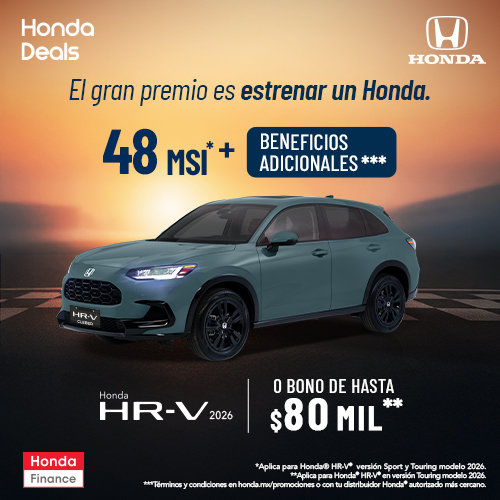 HR-V® FINANCE 24 MSI Vigencia del 02 al 30 de septiembre de 2025 o hasta agotar existencias lo que suceda primero. 24 meses sin intereses en la compra de una Honda® HR-V® versión SPORT y TOURING modelo 2026, con 50% de enganche y plazo de 24 meses, con un CAT de 30.2% sin IVA promedio informativo. No considera el costo del seguro de daños ni de vida, mismo que deberá ser cubierto financiado en la mensualidad. Crédito exclusivo con Honda Finance®. Aplican restricciones y está sujeto a aprobación de crédito. No incluye accesorios del vehículo. No aplica con otras promociones. Para más información acerca de requisitos y opciones de financiamiento visite su Distribuidor autorizado Honda® más cercano.