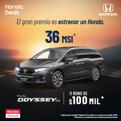 Honda® Odyssey® 2025 Honda® Odyssey® FINANCE 36 MSI Vigencia del 01 al 31 de octubre de 2025 o hasta agotar existencias lo que suceda primero. 36 meses sin intereses en la compra de una Honda® Odyssey® versión TOURING y BLACK EDITION modelo 2025, con 50% de enganche y plazo de 36 meses, con un CAT de 29.4% sin IVA promedio informativo. No considera el costo del seguro de daños ni de vida, mismo que deberá ser cubierto financiado en la mensualidad. Crédito exclusivo con Honda Finance®. Aplican restricciones y está sujeto a aprobación de crédito. No incluye accesorios del vehículo. No aplica con otras promociones. Para más información acerca de requisitos y opciones de financiamiento visite su Distribuidor autorizado Honda® más cercano.