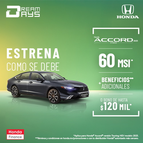 Honda® ACCORD® 2025 BONO DE HASTA $120,000 Vigencia del 1 al 30 de abril de 2026 o hasta agotar existencia lo que suceda primero. Bono flexible de $120,000 aplica en la compra de un Honda® ACCORD® en versión TOURING HEV modelo 2024 y 2025. El bono no aplica con otras promociones.