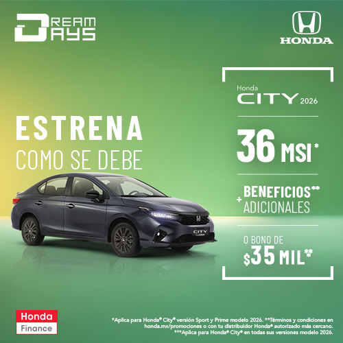 Honda CITY® 2026 BONO DE $35,000 Vigencia del 1 al 30 de abril de 2026 o hasta agotar existencia lo que suceda primero. Bono flexible de $35,000 aplica en la compra de un Honda CITY® en todas sus versiones modelo 2026. El bono no aplica con otras promociones.