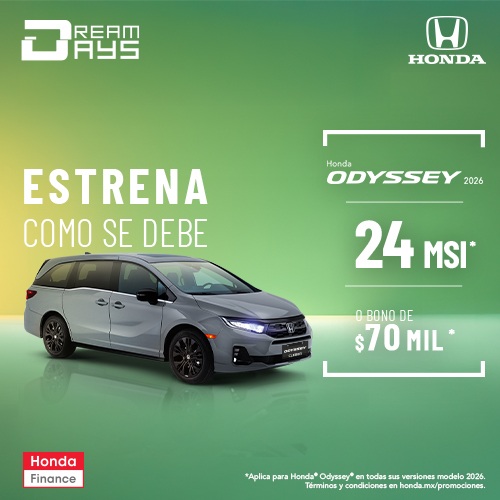 Honda® ODYSSEY® 2026 BONO DE $70,000 Vigencia del 1 al 30 de abril de 2026 o hasta agotar existencia lo que suceda primero. Bono flexible de $70,000 aplica en la compra de un Honda® ODYSSEY® en todas sus versiones modelo 2026. El bono no aplica con otras promociones.