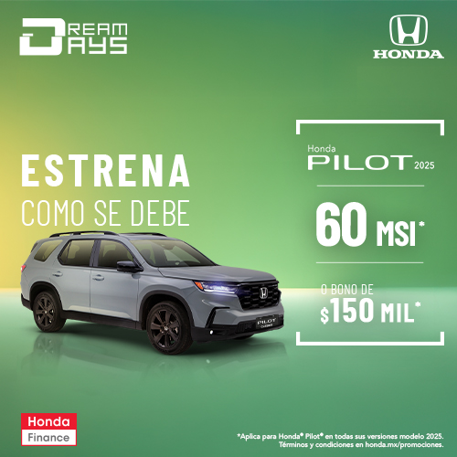 Honda Pilot® 2025 BONO DE $150,000 Vigencia del 1 al 30 de abril de 2026 o hasta agotar existencia lo que suceda primero. Bono flexible de $150,000 aplica en la compra de un Honda Pilot® en todas sus versiones modelo 2025. El bono no aplica con otras promociones
